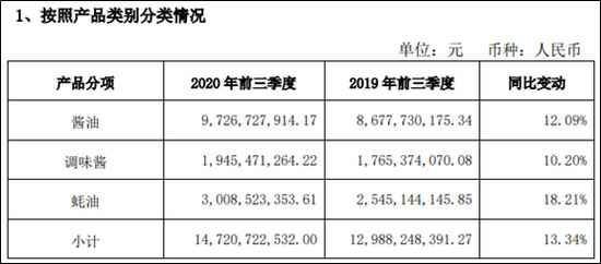 分产品看,海天三季度的酱油、调味酱、蚝油分别增长15.16%、12.35%、21.77%,均较上半年的增速有所增加。